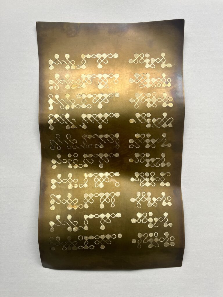 This body of work examines how language moves from speech to habit. It transforms everyday Tamil phrases, often used to control, silence, or diminish, into coded Bharati Braille, removing direct readability and translating speech into tactile form. These dot structures are then expanded into kolam patterns, a domestic ritual traditionally drawn at the threshold of the home.